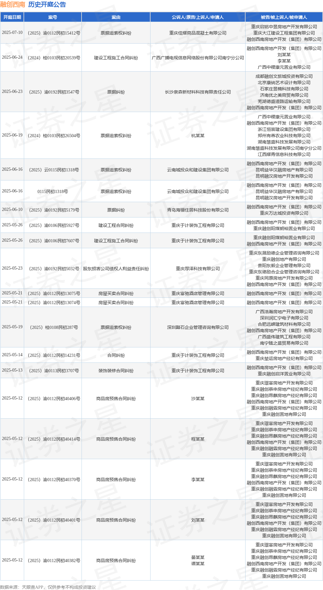 案号:(2025)渝0113民初3707号审理法院:重庆市巴南区人民法院案由:装饰装修合同纠纷当事人信息: 原告/上诉人:重庆于计装饰工程有限公司 被告/被上诉人:融创西南房地产开发(集团)有限公司、重庆融创启洋置业有限公司开庭日期:2025年5月13日根据统计,近一年内以融创西南房地产开发(集团)有限公司为当事人的历史开庭公告有718则,其中案由为“票据纠纷”的公告以282则居首,其次为“票据追索权纠纷”有181则,“商品房预售合同纠纷”有73则。历史开庭公告(前20条)如下: